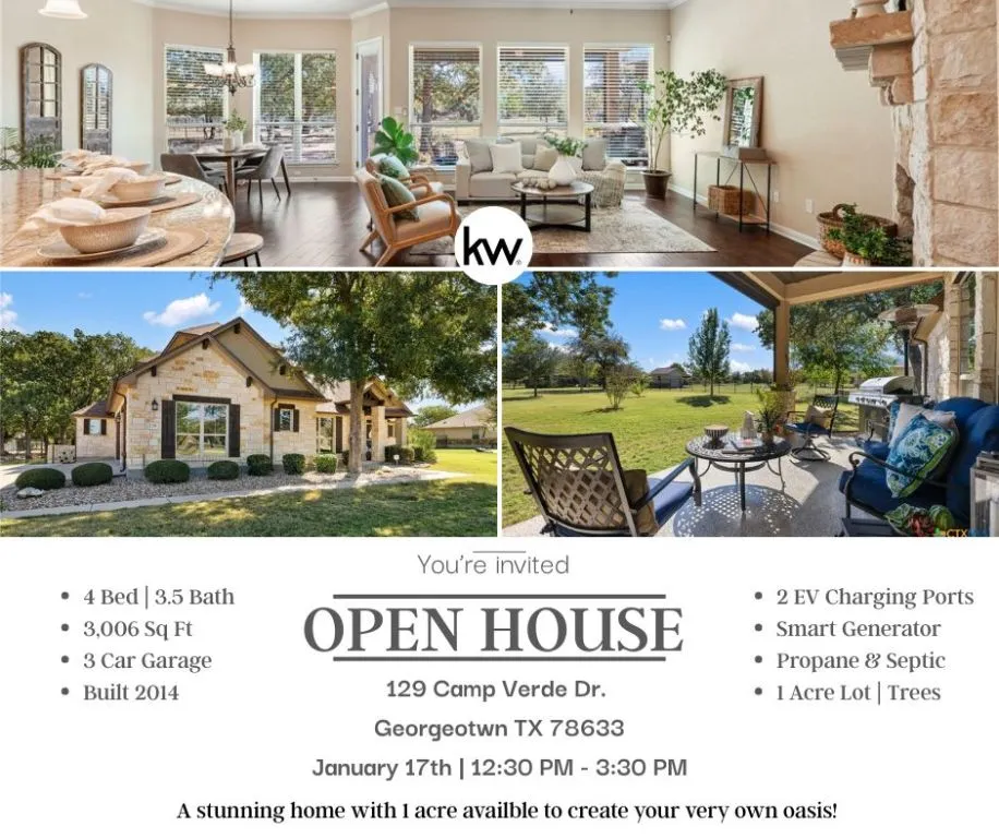 Welcome to 129 Camp Verde Dr., located in the desirable Mission Oaks community. Built by Gidden Homes in 2014, this property features the sought-after Aledo IV plan on a beautifully wooded homesite. The open floor plan includes wood floors, crown molding, and a cozy Texas-stone fireplace in the living room. This 1.5-story layout offers 4 bedrooms, including the main bedroom on the first floor, an office, two secondary bedrooms, and a Jack-and-Jill bathroom. The second floor includes a large game room/living space, along with a private suite with its own full bathroom. The oversized kitchen island provides exceptional cabinet space, complemented by Venetian Gold granite counters that pair seamlessly with the wood and tile floors. Stainless steel Whirlpool appliances. Situated on one acre, the property offers over 40 native Texas shade trees and a covered back patio that delivers both serenity and ample space for gatherings. The patio also features retractable screens for comfort during the hot summer months. Additional features include a three-car garage with two EV Connect charging stations, two air-conditioning units, and two water heaters. The home is also plumbed for a future hot tub if desired.