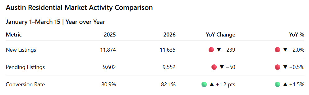 Austin residential (Jan 1–Mar 12): new listings are up 0.7% YoY and pending contracts are now up 0.2% YoY. Supply and demand are both slightly ahead of last year as the spring market gets underway.